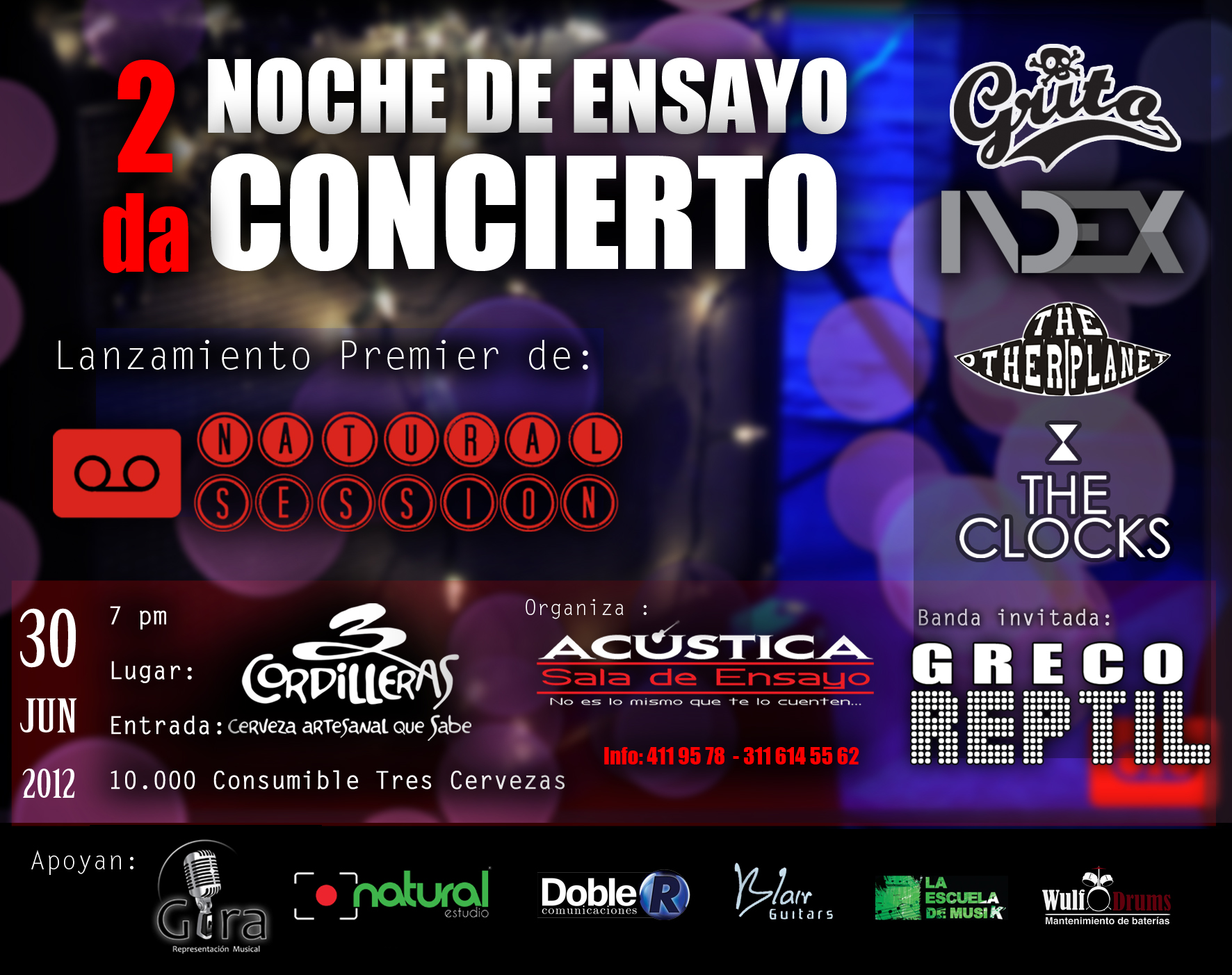 En este 2012 “La Segunda Noche de Ensayo Concierto” tendrá como invitados en tarima a las bandas: Index, The Clocks, Grito, The Other Planet y como invitado especial a Greco REPTIL; además podremos observar los videos grabados del Natural Session y contaremos con la participación de un ensamble realizado por estudiantes de La Escuela de Musik.
